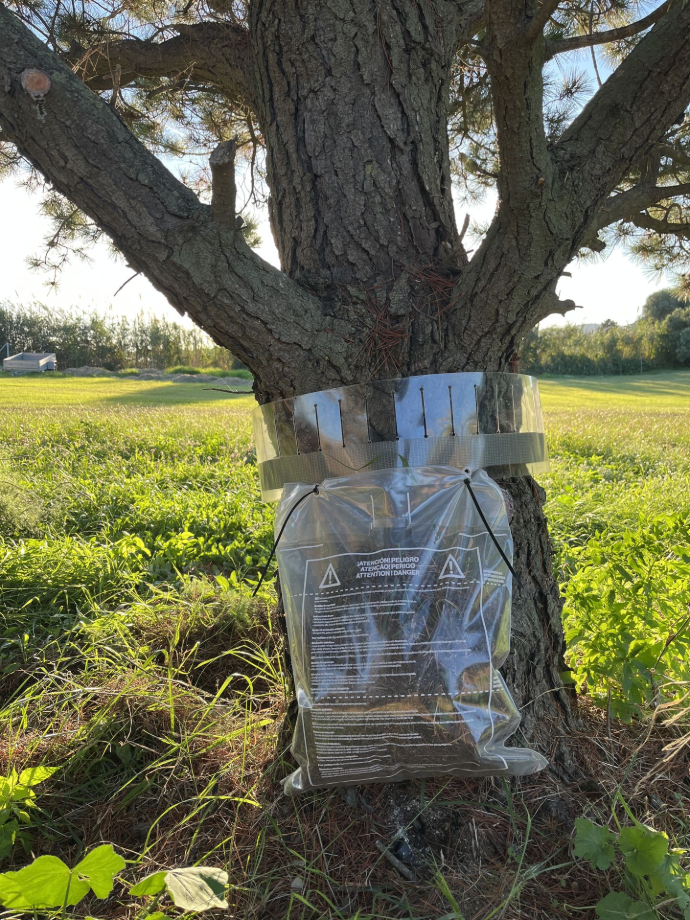 Mastertrap Pine est un piège à pins qui crée une barrière autour du tronc. Le déflecteur dirige le cortège vers un tube qui débouche dans un sac collecteur rempli de matériau de remplissage, évitant ainsi tout contact avec les personnes et la faune. Il s’agit d’une solution non chimique, facile à monter et réutilisable après un rinçage à l’eau.